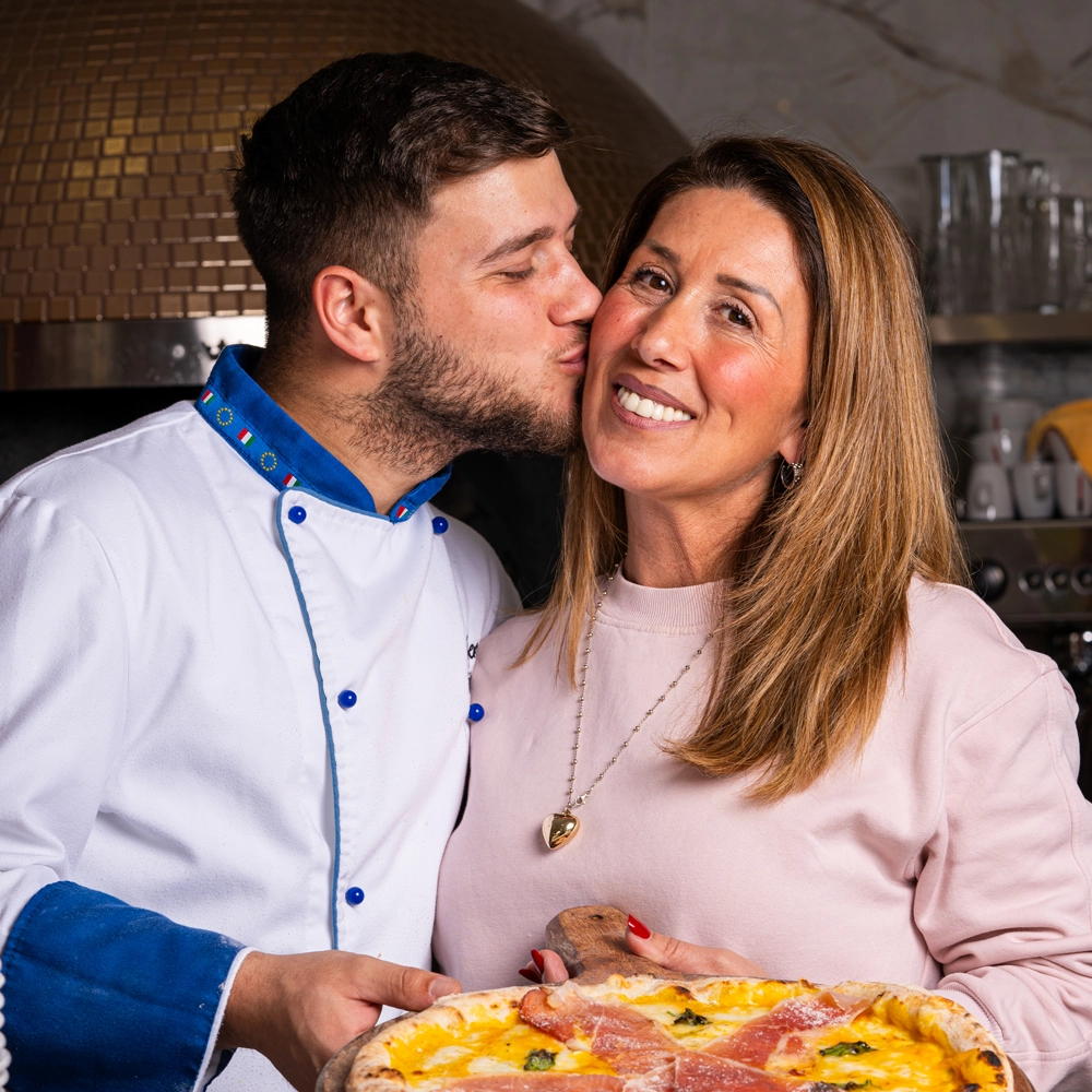 Gennaro Arrichiello comenzó en el mundo de la pizza con solo 17 años, cuando decidió probar suerte en una pizzería de Madrid, idea que apoyó toda su familia *fotografía de Gennaro y su madre. Lo que empezó como una experiencia nueva se convirtió rápidamente en una pasión que cambió su vida.